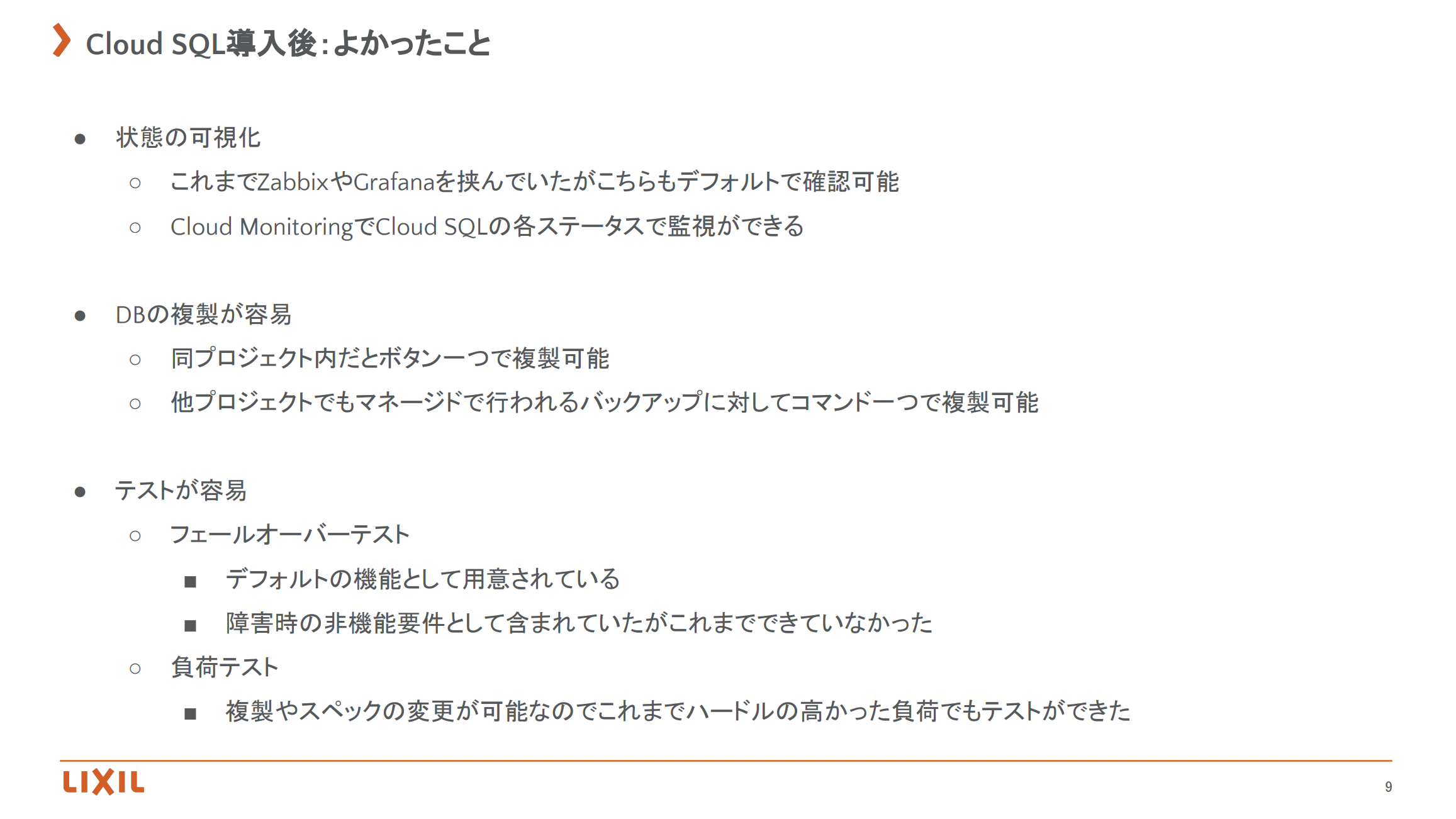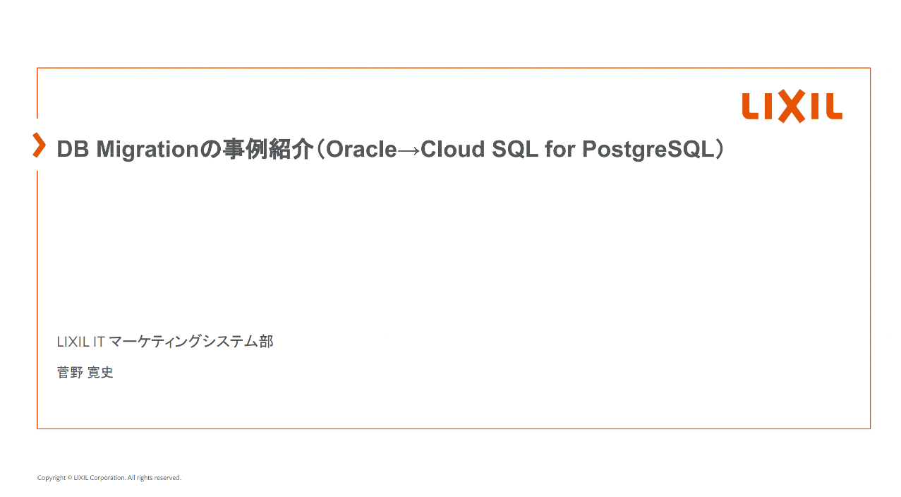 本日の講演は、LIXIL菅野様による『DB Migrationの事例紹介(Oracle→Cloud SQL for PostgreSQL)』をお話し頂きました。DB Migrationという言葉にすると一見単純そうだが、実際に実行する道のりは険しく、またそれを遂行された苦労と遂行力が伝わってくる非常に参考になるお話でした。