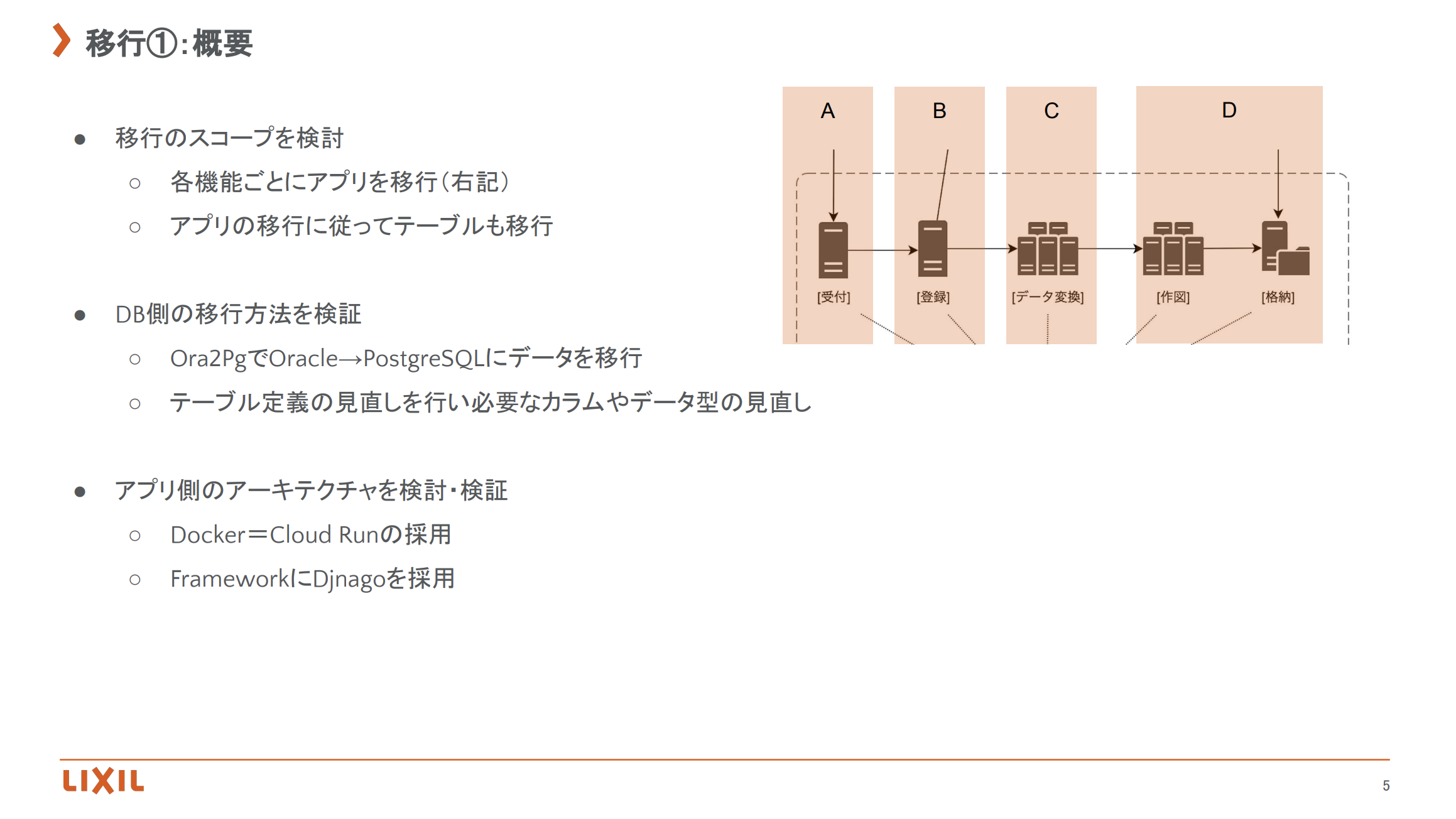 - DBの移行方法を検証(データ移行、テーブル定義見直し等の技術観点)