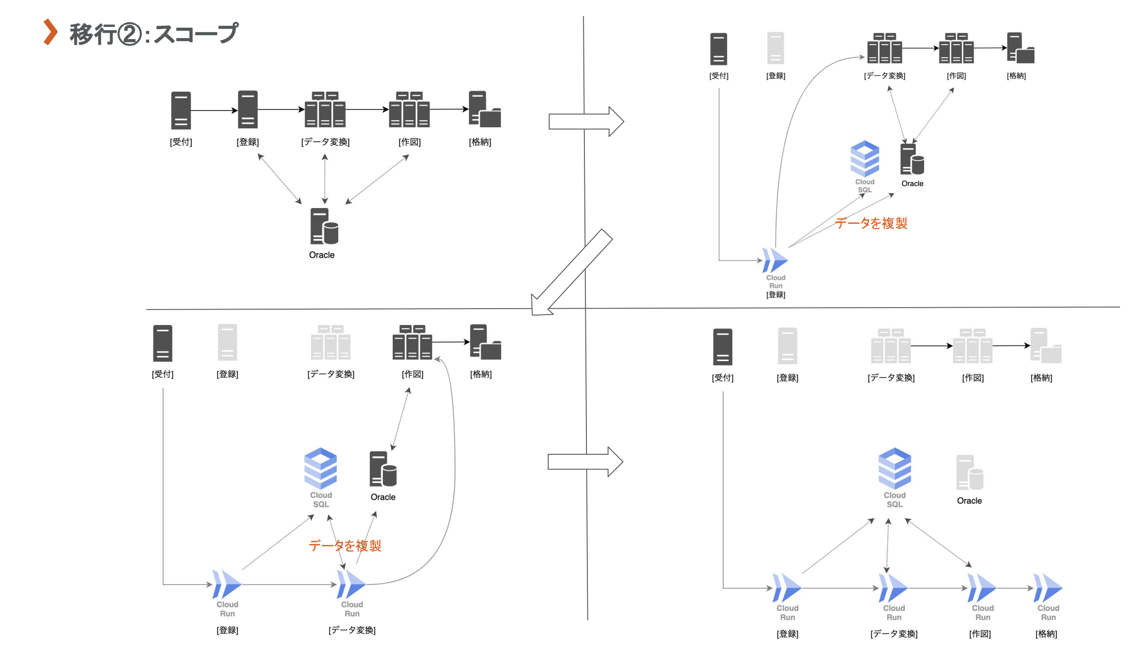 - 移行スコープを検討(スコープ毎の段階移行もここで検討)