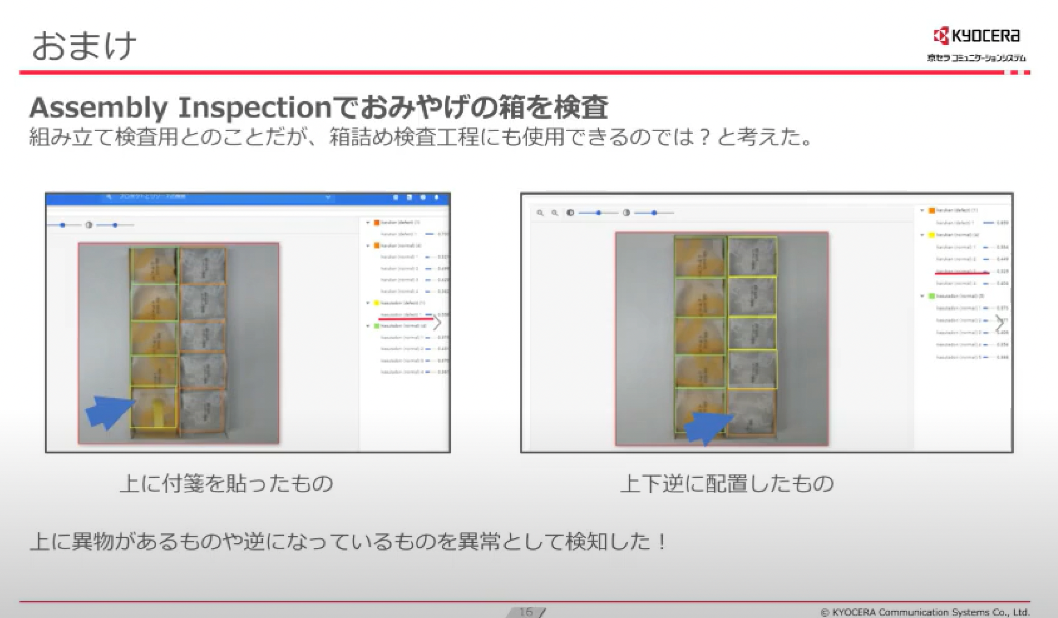 Assembly Inspectionをおみやげ箱で試したところ、ちゃんと異常検知してくれるみたいです。箱詰検品作業を人力で行っている会社では、試す価値がありそうです。
